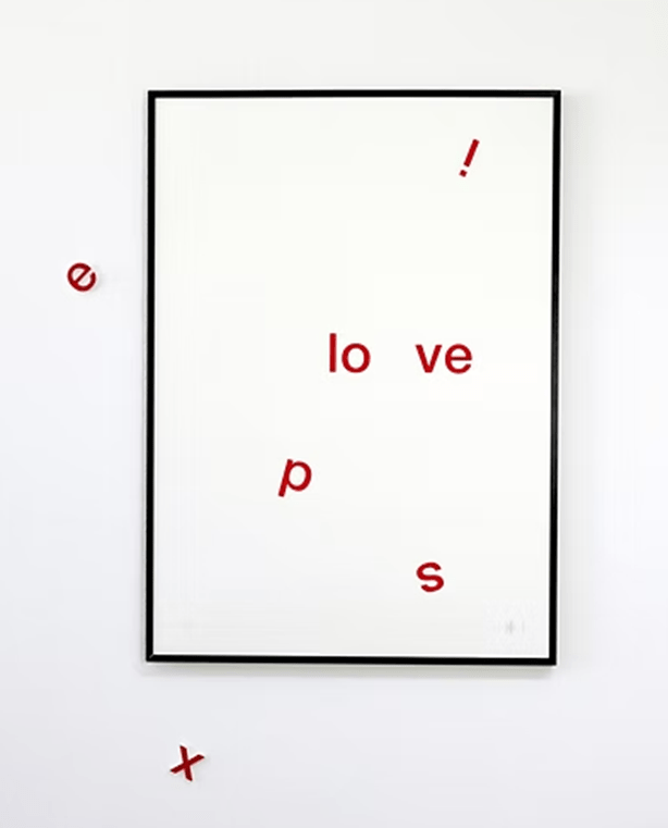 While perhaps our first thought upon seeing the word “explosive” is something negative (a bomb or other like catastrophe), the word of course can easily have positive connotations. I love that it resolves into “love”, and I really love how it literally bursts beyond the frame — a creative bit of mixed media that gives the piece an installation feel.