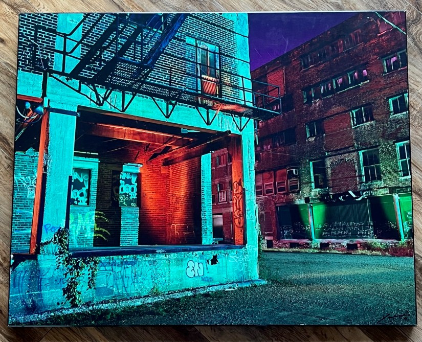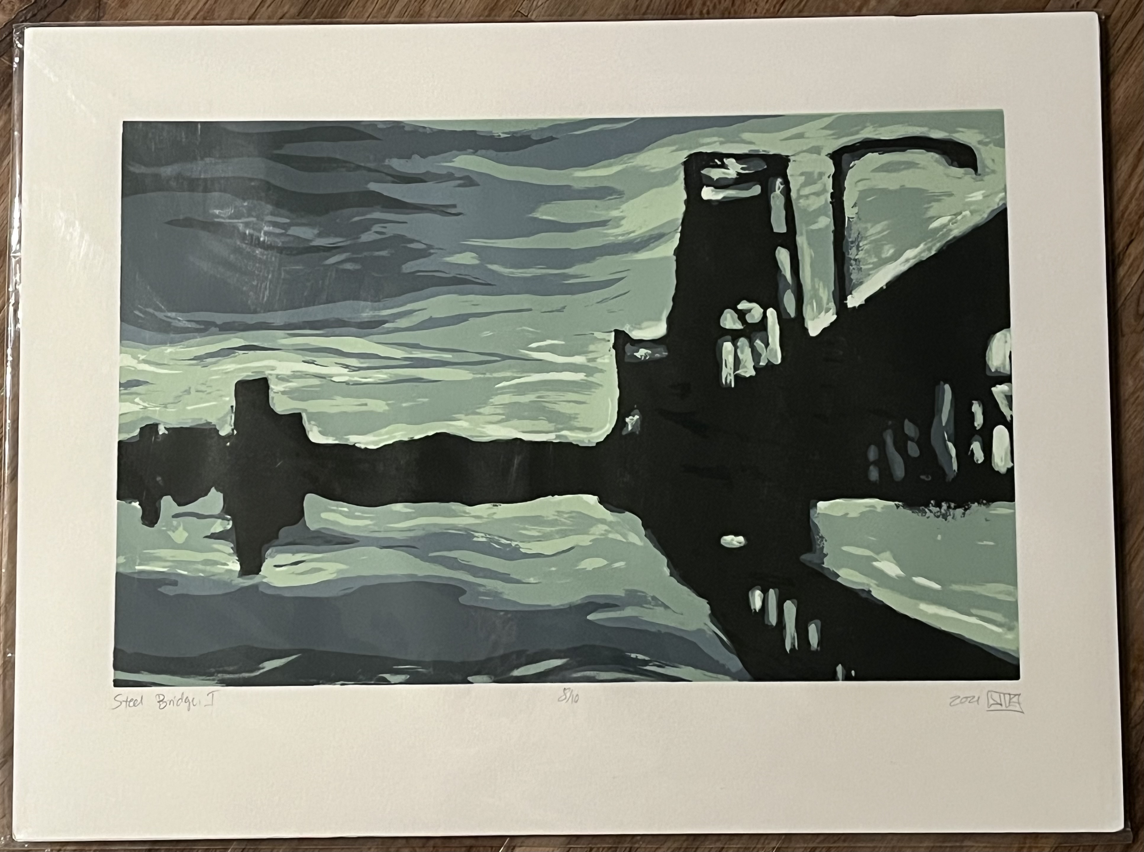 While I’ve always enjoyed having art on my walls, I only began collecting in earnest in 2024. I tend to gravitate towards at least semi-abstracted work, though I also enjoy word and pop art and I’m a sucker for a good bridge scene. Click the artists to see more.