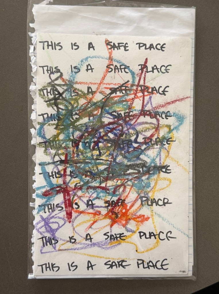 The idea of “safe spaces” and “safe places” really came in for a beating in recent years as part of the anti-“woke” backlash. The claim was that “safe spaces” were unrealistic, an attempt by fragile snowflake students to avoid toughening up and encountering the real world. But what we’ve actually seen emerge from the anti-DEI campaigns of the past few years is a concerted effort to make the world affirmatively unsafe — not in any figurative sense, but in very tangible, objective reality — for all sorts of marginalized communities, including but not limited to queer, gay, lesbian, bi, and trans individuals. In that context, there is something bracing about seeing “This is a Safe Place” scribbled out of existence by rainbow crayons–a gesture towards safety and inclusion slowly (and then very quickly) yanked away.
