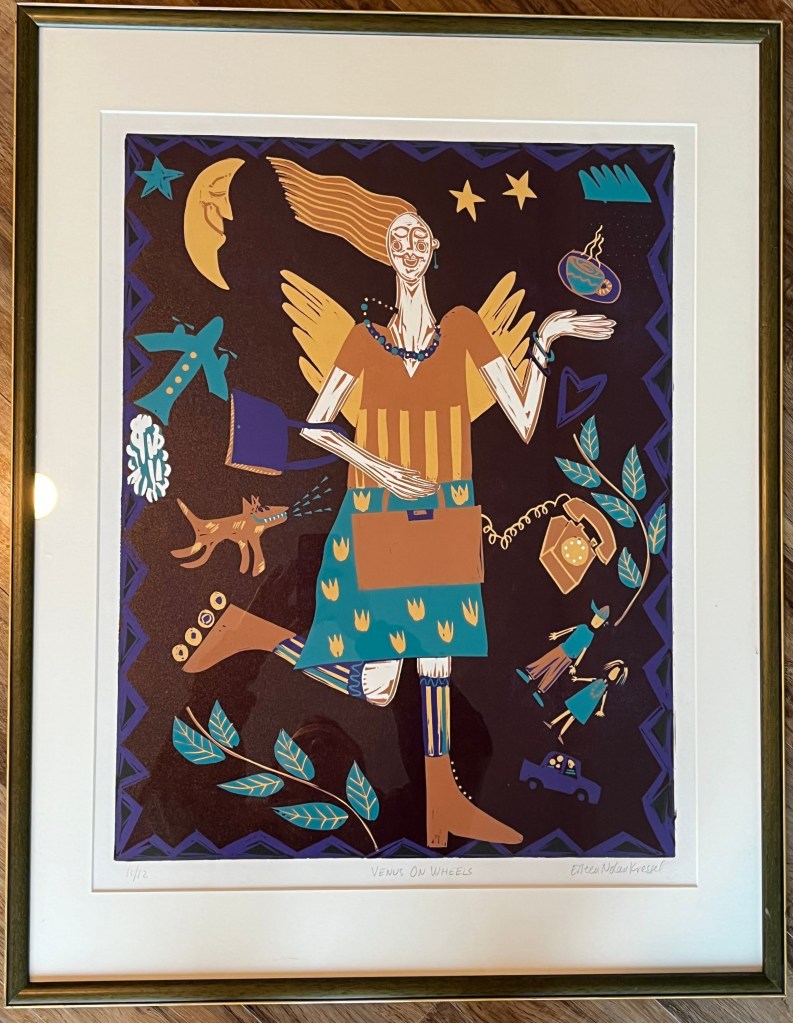 We discovered this piece at a local vintage store, where it stood out from the innumerable still lifes and landscapes with its happy, cartoonish chaos. It quickly became the centerpiece of the “gallery wall” on the far side of my wife’s home office, but took on additional significance when we learned shortly after our purchase that my wife was pregnant! The piece cheerfully reflects the impossible juggling that characterizes parenting children while retaining a life of one’s own — an experience that for us was about to become a lot more than just fodder for art commentary!