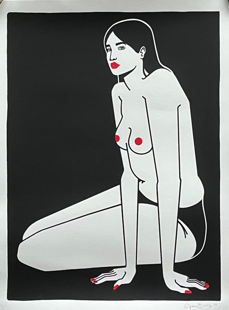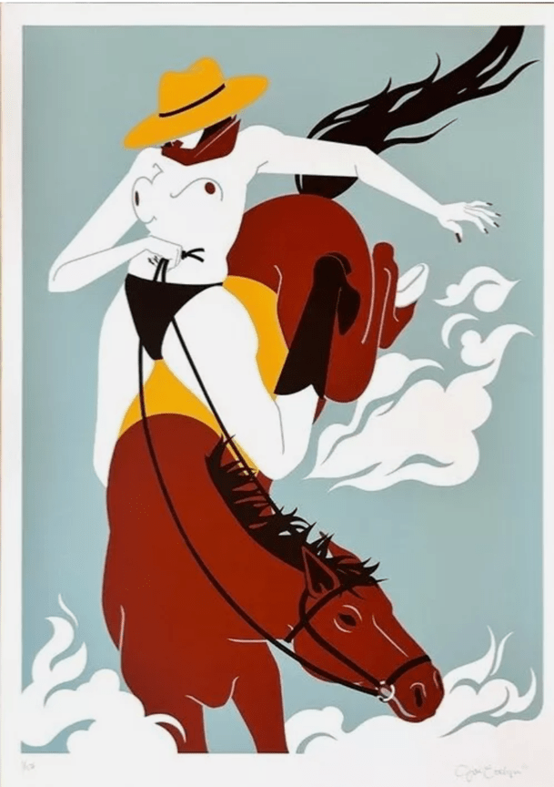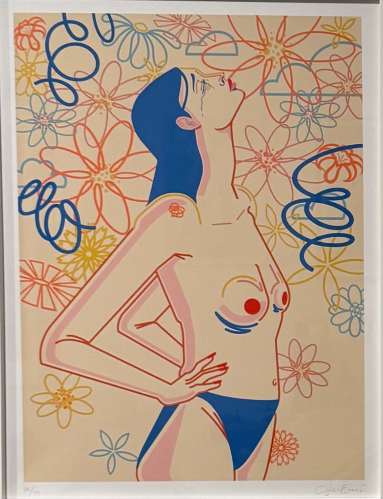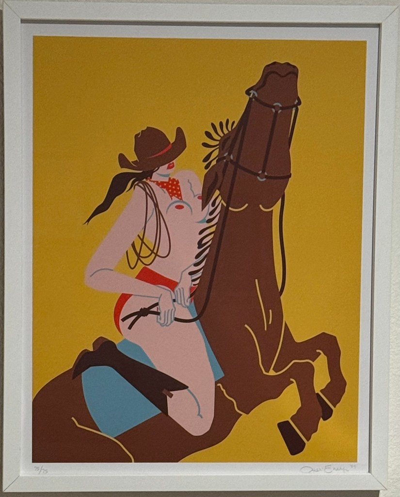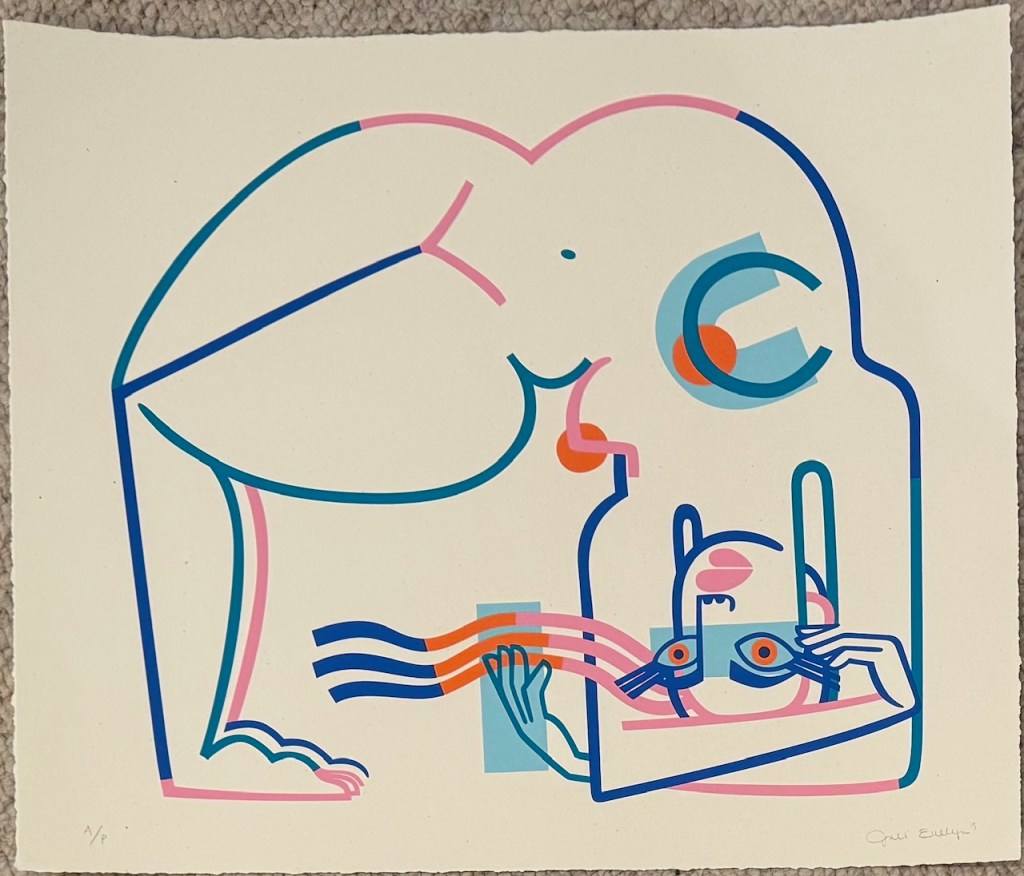 Always on the prowl for new Jillian Evelyn works, I bought these as holiday presents for the end of 2024 (after losing an attempt to purchase one of her paintings at an auction a few weeks earlier). Both pieces dovetail nicely with work already in my collection. “Giddy-Up”, of course, matches up with “Summer Camp ’23” in the “woman on horseback” genre. But “Gloom Bloom” caught my eye because of how it paired with Kii Arens’ lithograph “Vote Joy”, which I purchased in advance of the 2024 election as my way of donating to the Kamala Harris campaign. “Because she’s crying?”, my wife asked? “Because of the 70s-style flowers,” I replied — though in hindsight, I’d say we’re both correct.