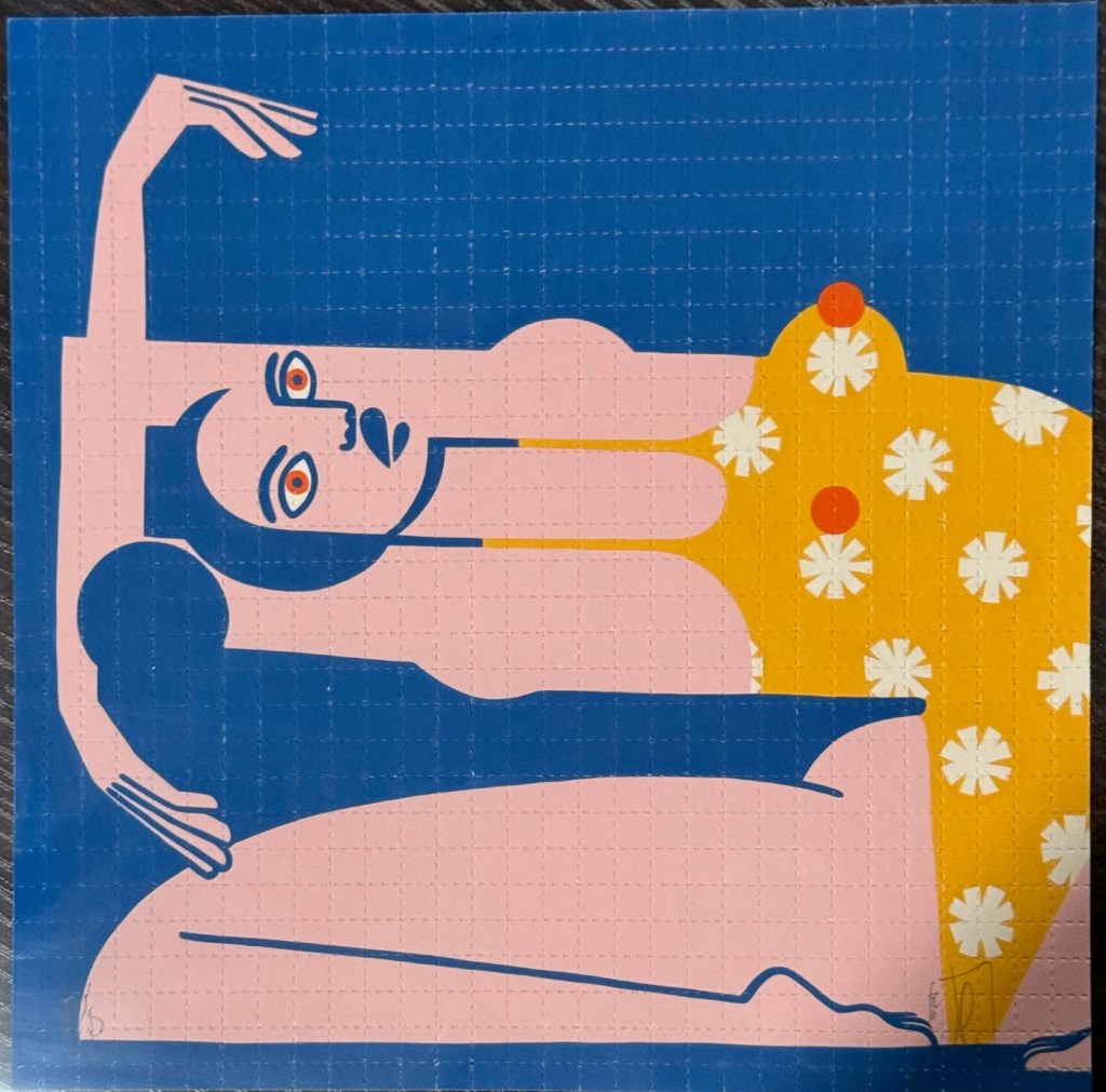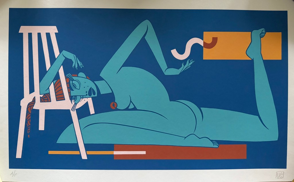 I’m not normally attracted to figural art (nudes or otherwise), but Evelyn’s works immediately grabbed me in how they evoked some of the great pop artists of the 20th century–simple designs, a limited color palette, timeless subject matters, and yet a distinctive and immediately recognizable style that feels fresh and contemporary without being faddish. So I resolved to be undeterred by the difficulty, and eventually I was able to obtain a copy of “Summer Camp ’23” (appropriate, since this print was made as part of The Jaunt series here in Oregon). And when I saw that “Pool Side” and “Stifled” were also for sale at reasonable prices, I jumped all over them.