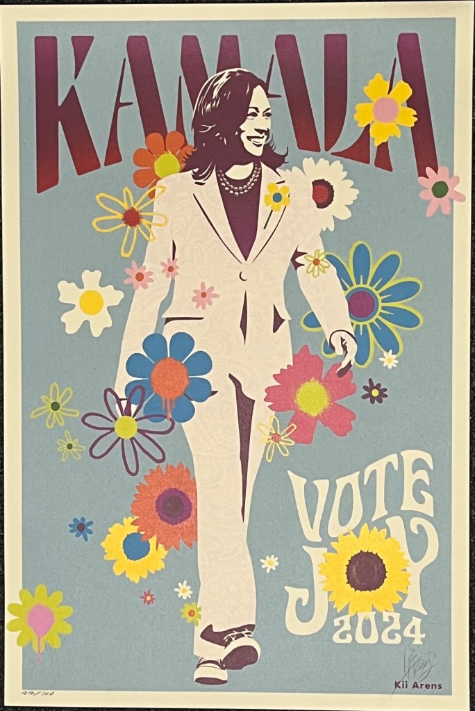 When I purchased this print in October 2024 (what better way to donate $250 to the Harris campaign?), I joked that in one month it would either become the most treasured or the most depressing item in my household. Sadly, it is the latter. Nonetheless, I do not regret purchasing it at all. Even, or perhaps especially, in dark times, it is important to remember what could have been, because it is also a reminder of what could one day become. And I am a deep believer in joy as an important political emotion; that is something I will never apologize for, no matter how grim the world sometimes seems.