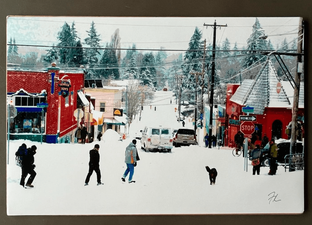 Also known as “Anytown USA”, I first saw this print while browsing in a gallery a few days after purchasing “Voodoo BW”. It was unlabeled, but once again I appreciated the juxtaposition of the bright, almost cartoonish reds against the pure white snow and the muted, painted greens.