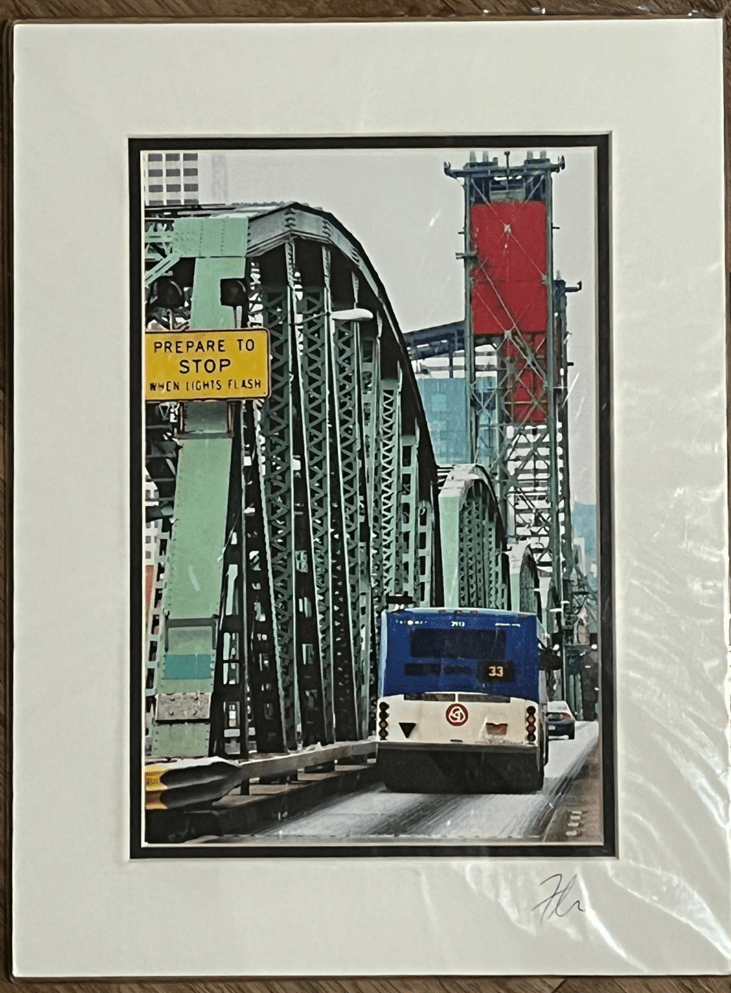 Tobin also was kind enough to gift us an additional print as a gift for the baby (below). I can honestly say that it is his favorite thing to look at in his bedroom! Admittedly, “babies love buses” wasn’t the longest-odd guess, but still, pat on the back for dad picking it out. And it gives us yet another bridge!