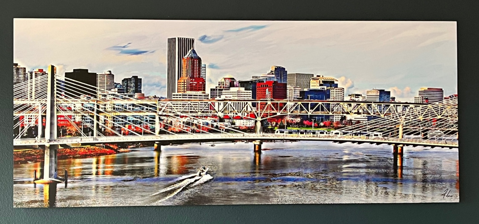 Shortly after Nathaniel was born, we visited Tobin at his house during a garage studio sale. We have a very large space in our dining room that was proving extremely difficult to fill with art that wouldn’t get swallowed up. This panoramic view of the Tillikum Bridge fit the bill beautifully, and not just because we’re fans of bridges as a subject matter (in addition to Kristine Kordell’s bridge prints, that room also features a vintage 1960s-era sculpture of the Brooklyn Bridge by C. Jeré).